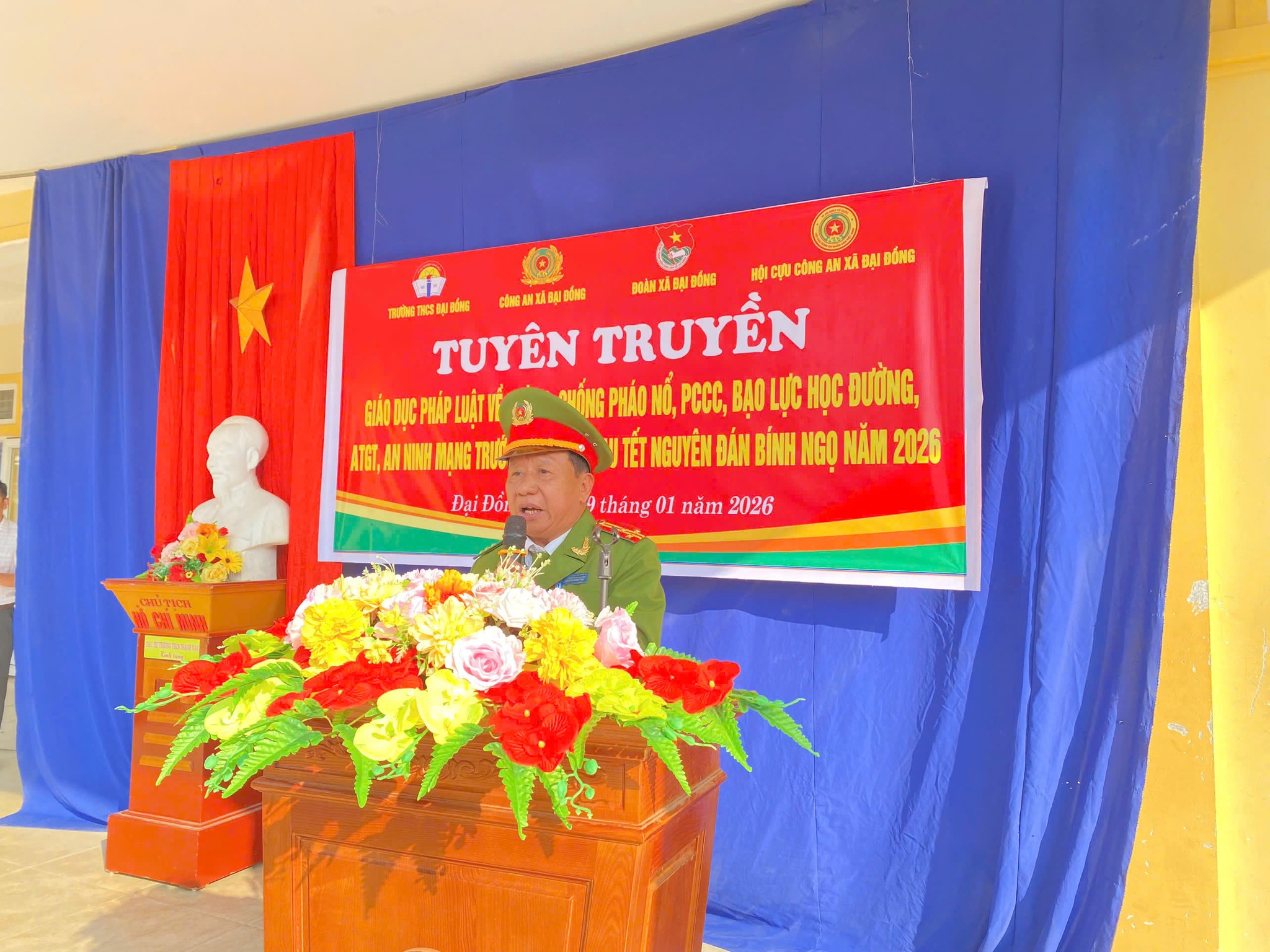 Chiều ngày 29/01/2026, Công an xã Đại Đồng phối hợp với Chi hội Cựu CAND xã Đại Đồng và Đoàn thanh niên xã tổ chức buổi tuyên truyền pháp luật tại Trường THCS Đại Đồng với 05 chủ đề: Phòng, chống pháo nổ; Phòng chống bạo lực học đường; Phòng chống ma túy học đường; An ninh mạng và trật tự an toàn giao thông cho hơn 470 học sinh của nhà trường.